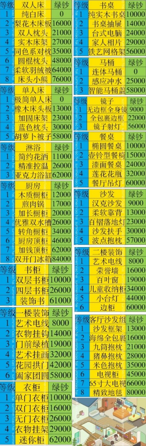 个人经验:刚开始优先升级房间里的家具,家具升级才能让租金收益越来越多,升级更快。海滨别墅具体的家具升级明细请看下图: