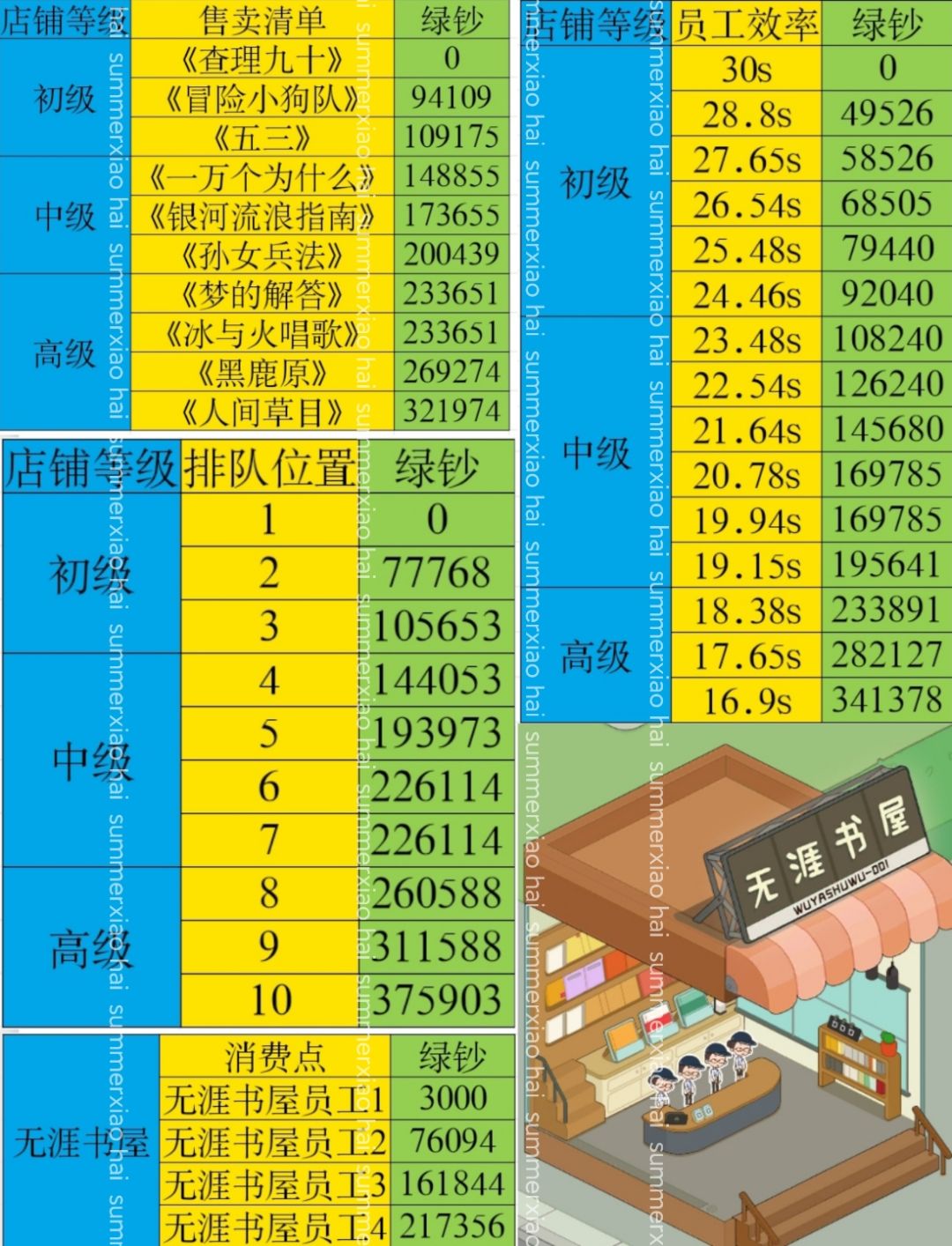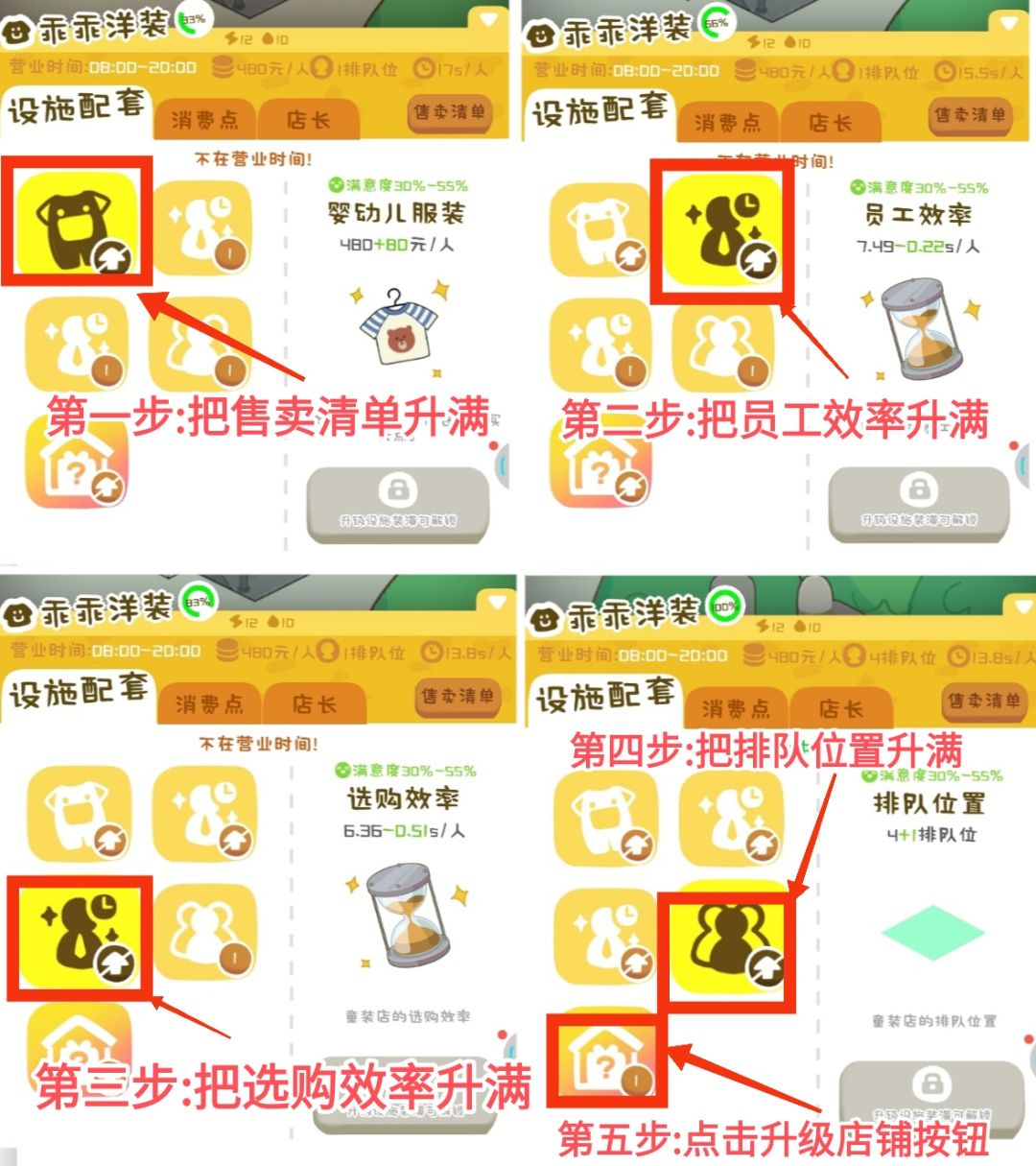 提高租客满意度就需要升级店铺和公共设施了,分别是乖乖洋装、无涯书屋和海景游泳池,请看下图: