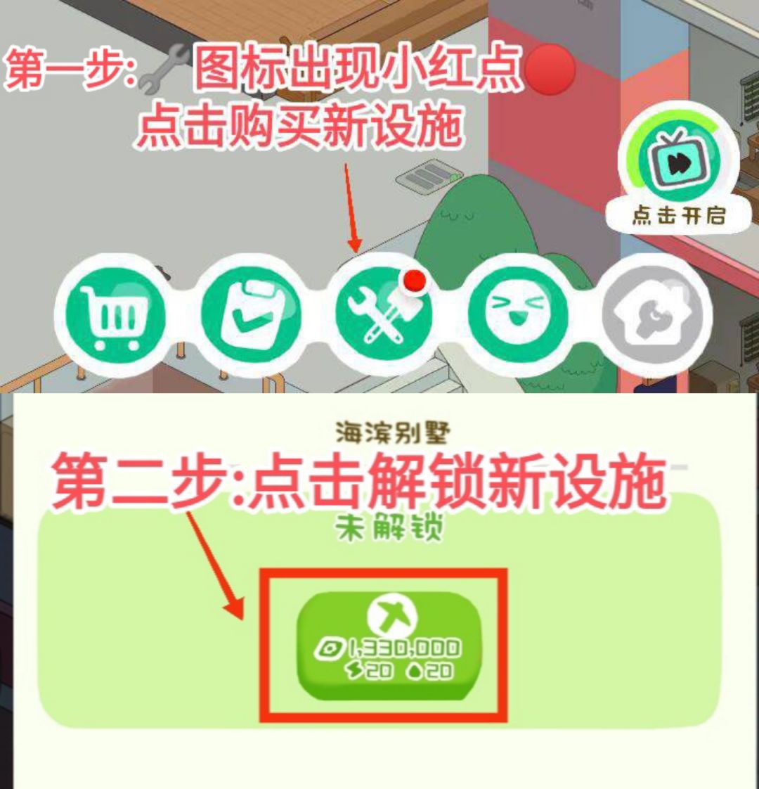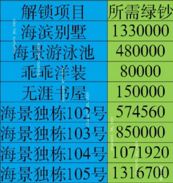 海滨别墅一共有5幢,还有2个店铺和一个公共设施。只有第一幢别墅是随着社区解锁免费提供,房间和设施解锁需要多少绿钞呢?请看下图: