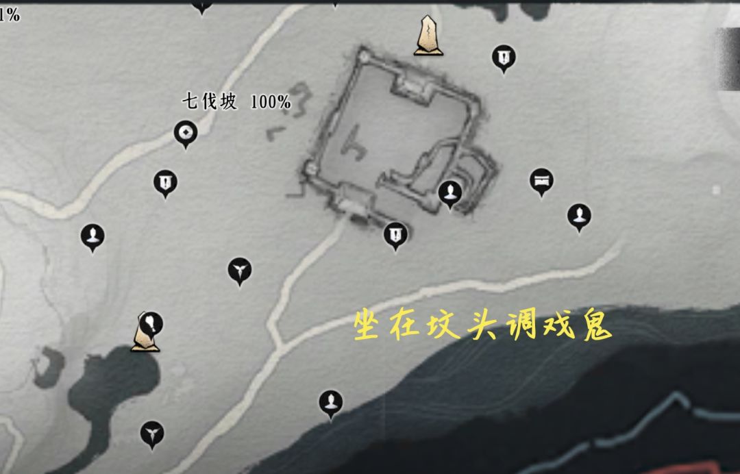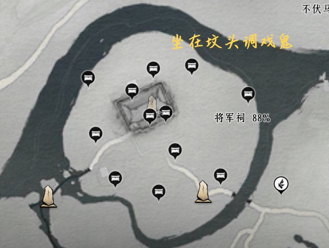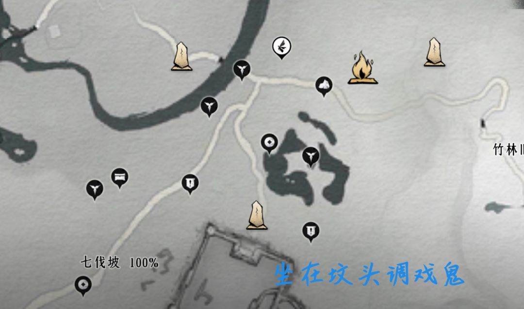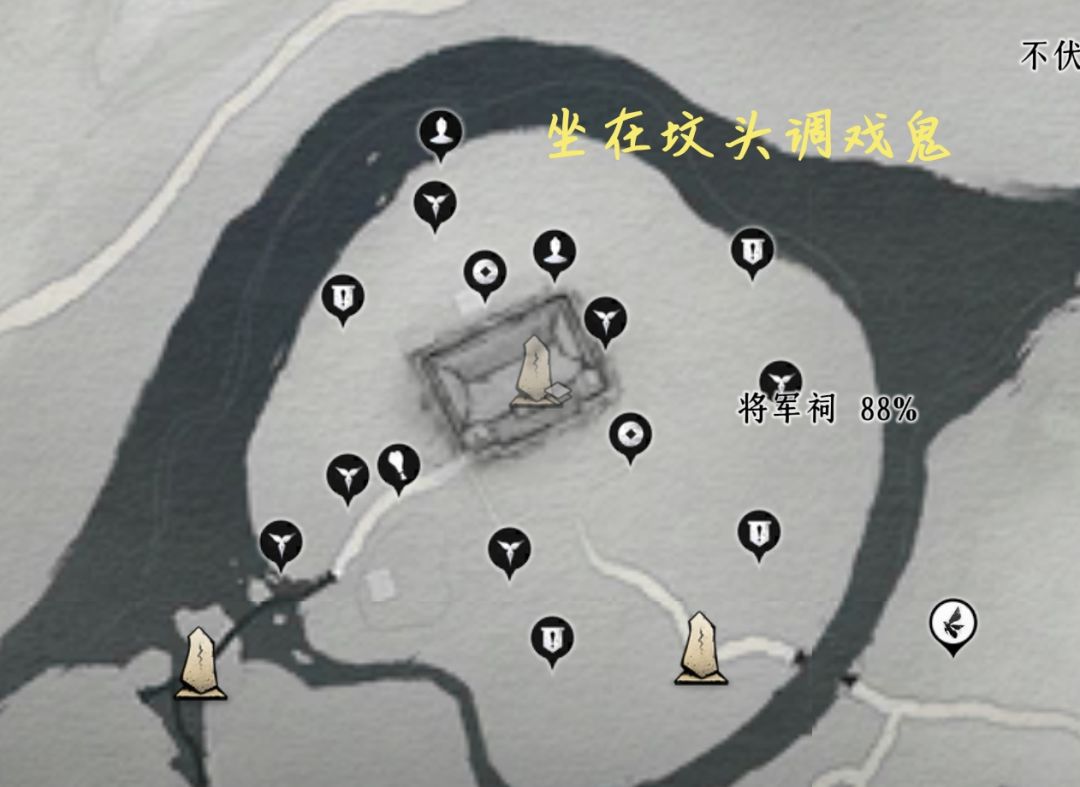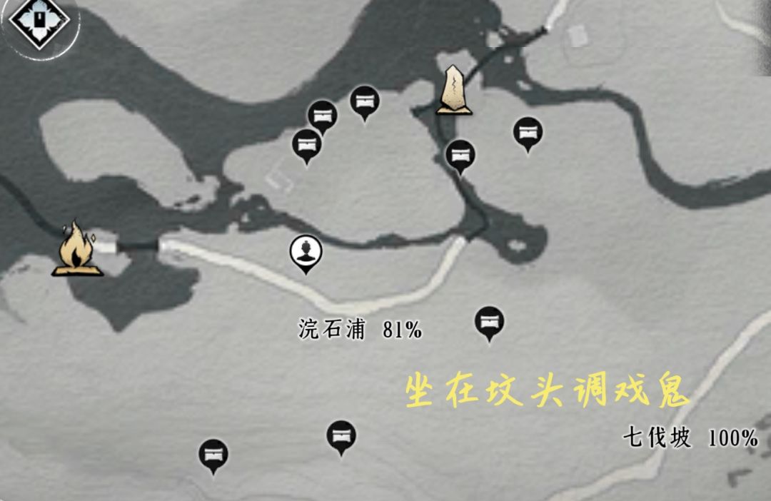底下宝箱4个(在偷师洞里)、蹊跷、妙妙喵、猫戏、曲径寻幽(蓝蝴蝶)、野祀游火(与宝箱同用一个标记)、营地、射术比试