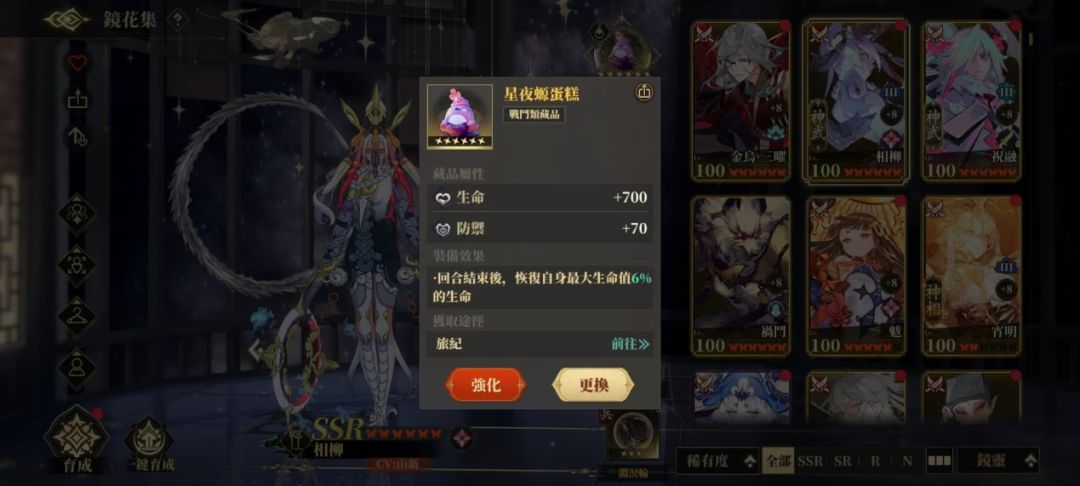 藏品推荐星夜螈蛋糕(极力推荐):回合结束回复相柳最大生命的治疗量,提供续航,同时又能触发相柳【双头蛇吻】被动。
