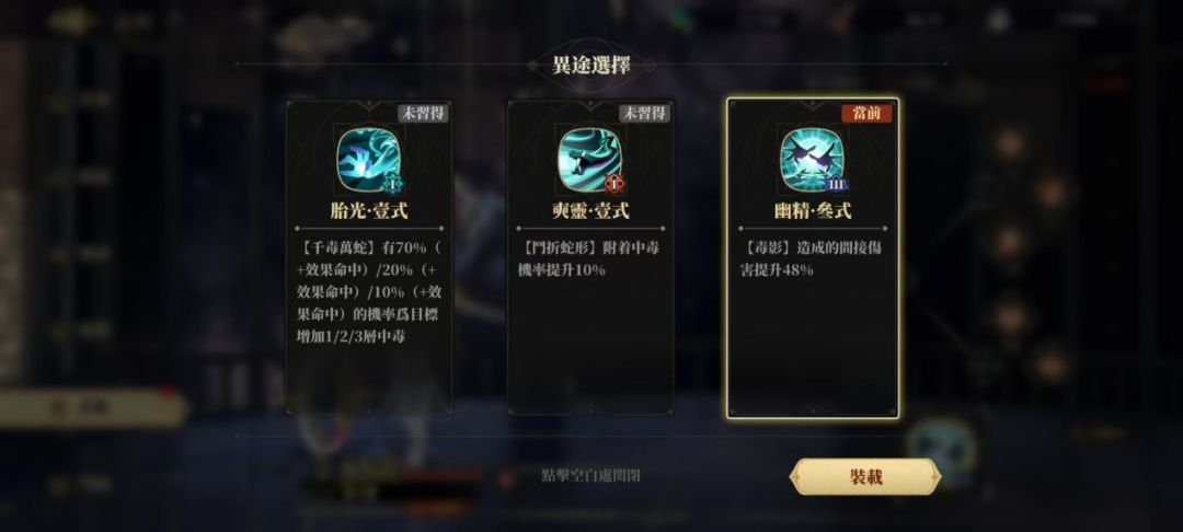 奇术·胎光:提高普攻附加高层数中毒的概率,在不装配【尾宿】的情况下不建议选择,相柳本身仍然是一个依靠灵气技和被动输出的镜灵,普攻叠毒的频率对于相柳来说依然过慢。