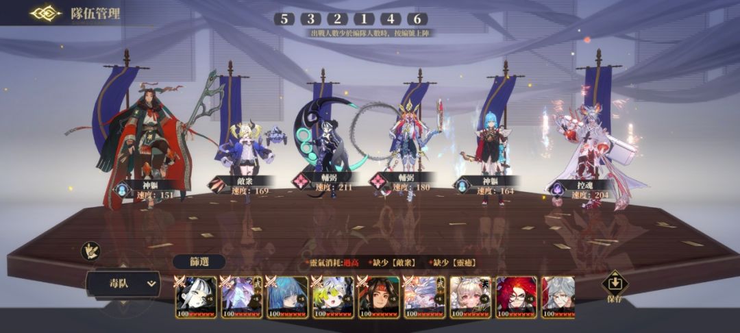 核心角色:相柳、后土。相柳施加【中毒】【毒影】使敌方受到间接伤害增加,后土负责主要输出,结算毒伤同时使对方无法免疫【中毒】效果。帝江既可以叠加毒印又有着与毒队机制十分契合的群体治疗。