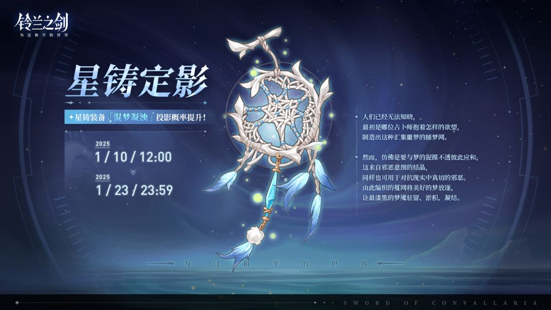 「星铸定影」限时投影将于 2025/01/10 12:00 - 2025/01/23 23:59 开启,全新星铸装备「混梦凝浊」投影获取概率将大幅提升!