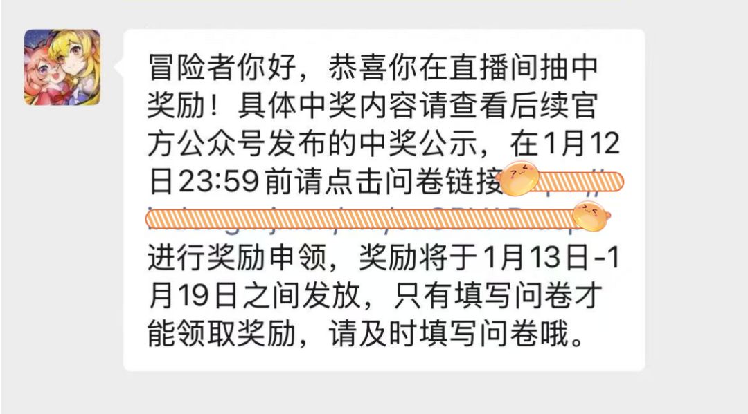 5、在私信界面内,点击官方私信发送的问卷链接进行奖励申领,问卷将于1月12日23:59截止征集,过期未填写问卷则无法领取奖励。
