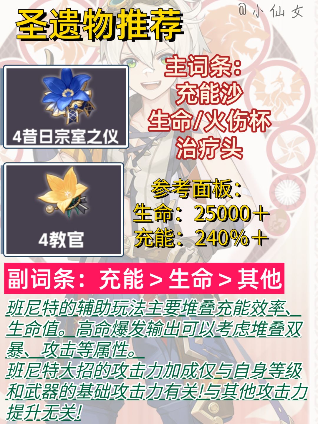 配合反应输出角色时,可选择「教官」4件提高角色元素精通;配合直伤输出的攻击倍率角色时可考虑「昔日宗室之仪」4件。