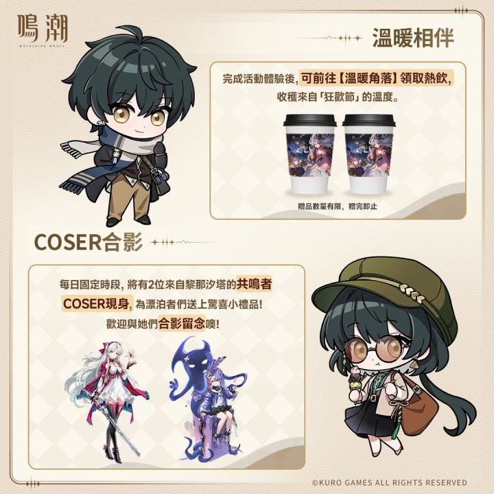 -每日固定时段,将有2位黎那汐塔的共鸣者Coser(cos珂莱塔、洛可可)现身,为漂泊者们送上小礼品,与她们合影留念~