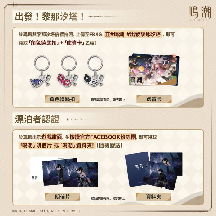 于现场出示鸣潮游戏画面,并按赞官方Facebook粉丝团,即可领取鸣潮明信片或鸣潮资料夹!(随机发送)