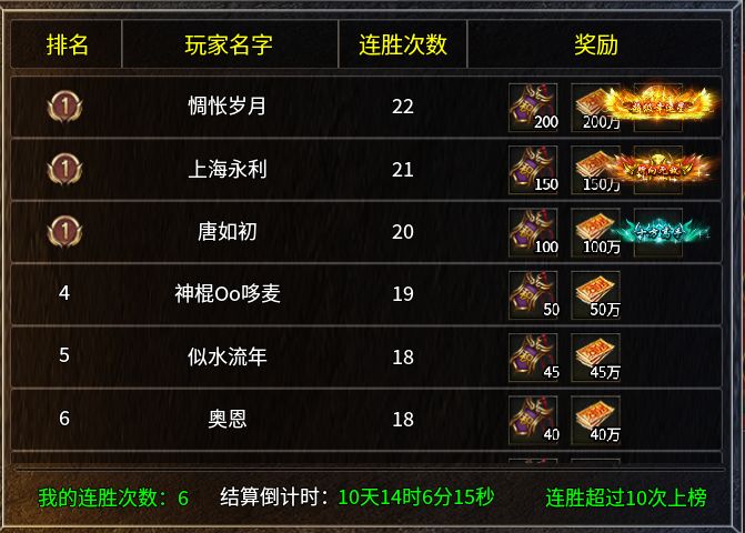 11、连胜10次以上进入排行榜,次数相同则按达成时间排名,每15天为一轮,到期重置榜单并通过邮件发奖