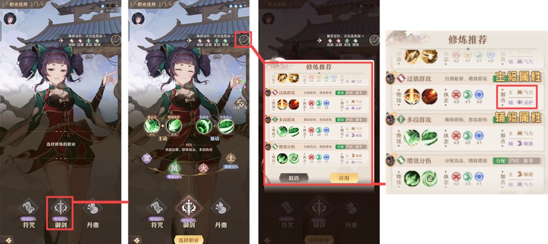 这里选了御剑后就会出现属性的选择,依然是选择加成比较多的属性风,至于技能的连招现在没有大概的思路的话,可以点开右上角这里,会有推荐的连招选择,后面是主修和辅修的属性,这里就最好选择李弈星前面加成高的两项来修炼最好,没有的,那就选择一项加成最高的有就行