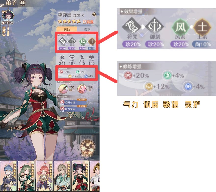 第二栏是基础属性可以不用看,第三栏就是我们到时候修炼用的上的了,就如同它这个名字一样,分别是修炼各个属性后带来的增幅效果,分别为气力,体质,敏捷,灵护,其实也就是攻击力,血量,速度和防御。