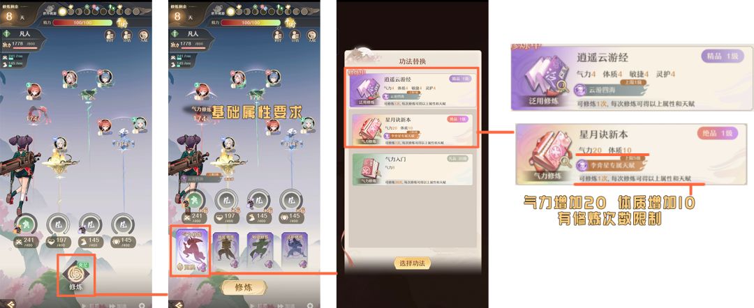 功法这里主要是注意前面说的,每门功法增加的属性,尽量选择我们需要主修和辅修的属性有的功法就行,还有注意下功法下面的小字,每门功法都是有修炼次数的,像自带的这些都只有一次机会,所以很多时候触发了执念卡的功法的话,记得留下来一些,要不然到后面没有功法修炼就太亏了。