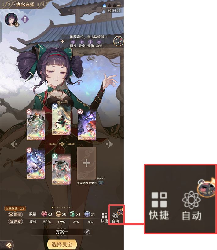 选完之后就是选择执念卡,这因该也是让小伙伴们最懵逼的地方,也有省流的办法,右下角这里有个自动,点了,就可以让系统一键选择
