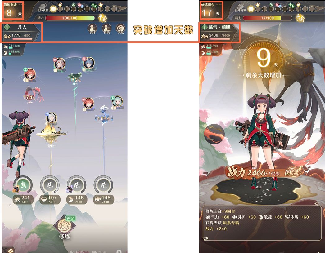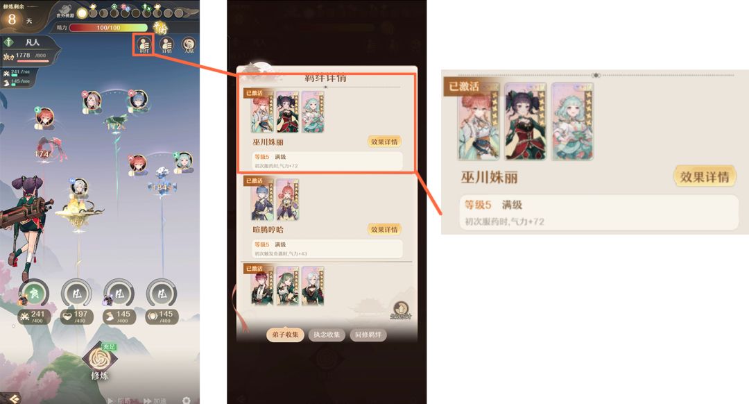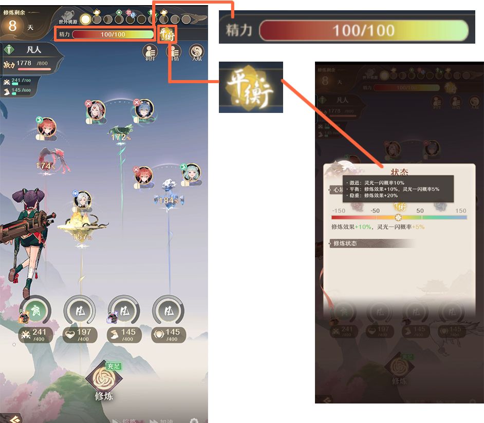 上面的这一栏是精力会在每次修炼结束后降低,当降低到三四十左右的时候,就会影响修行进度和加成,这个可以吃药回复,不过这样也会直接跳过一天的修炼时间。