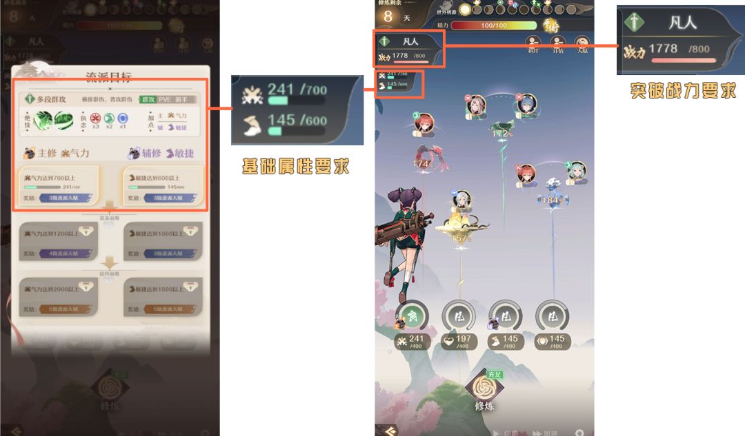 左上角这里是修仙境界和战力,每次突破小境界的要求达到后面的这个战力需求,以及下面的属性要求,满了才能突破修为。