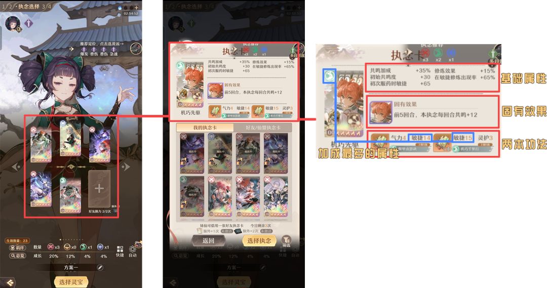 主要是第三栏的,这两个就是功法,分别在第一次共鸣和第二次共鸣的时候会出现,给到选择。上面的气力4,敏捷14,就代表了这本功法每次修炼后,会增加的气力和灵护基础属性数值,这个属性值加成最多的也与执念卡的属性有关,当然,这里是没有加上角色自身的属性加成和修炼的一些BUFF效果的
