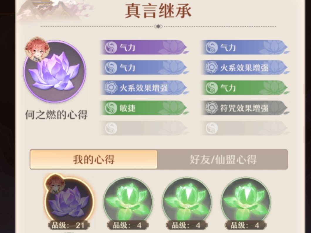 心得继承:每次修行结束之后都会进行一次心得感悟从而获得角色心得,在下次修行时每次提升一个阶段后就会进行一次心得继承,心得主要继承和自身主修/辅修属性和高品质天赋效果,角色修行的阶段越高,能继承的心得品质和数量也会提高,如果好友或者仙盟有好的心得也可用来继承