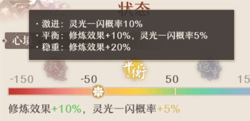 状态效果:分为心境和修炼状态两个部分,心境分为三个状态,激进状态主要提高灵光一闪10%概率,平衡状态有提升20%修炼效果和5%灵光一闪概率,稳重状态提升20%修炼效果;心境的状态可通过奇遇和部分执念卡固有效果改变,修炼状态buff效果分为正面buff和负面buff,负面buff并不算多,所以多数都是修炼效果提升或灵光一闪概率提升