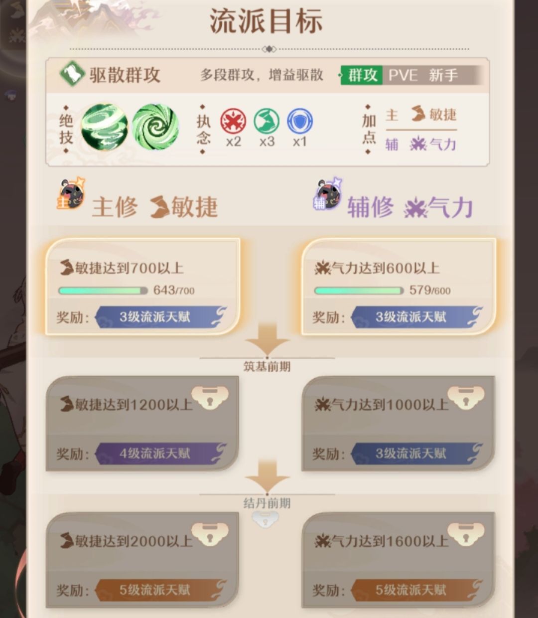 主修/辅修属性:弟子可修炼的属性一共分为气力(主攻击)、体质(主生命)、敏捷(主速度和暴击)、灵护(主防御),4种执念卡分别对应4种属性,朱雀主气力、玄武主体质、青龙主敏捷、白虎主灵护,主修的属性首先看该种类执念卡的数量,如果两个种类的执念卡数量相同,则看角色对对应功法提升的修炼效果