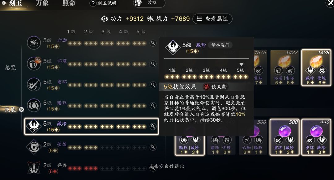 这也是为什么在上一篇的刻玉养成中,小编推荐大家第四个技能将“藏珍”升满,这就等于天香有了两个濒死被动效果。