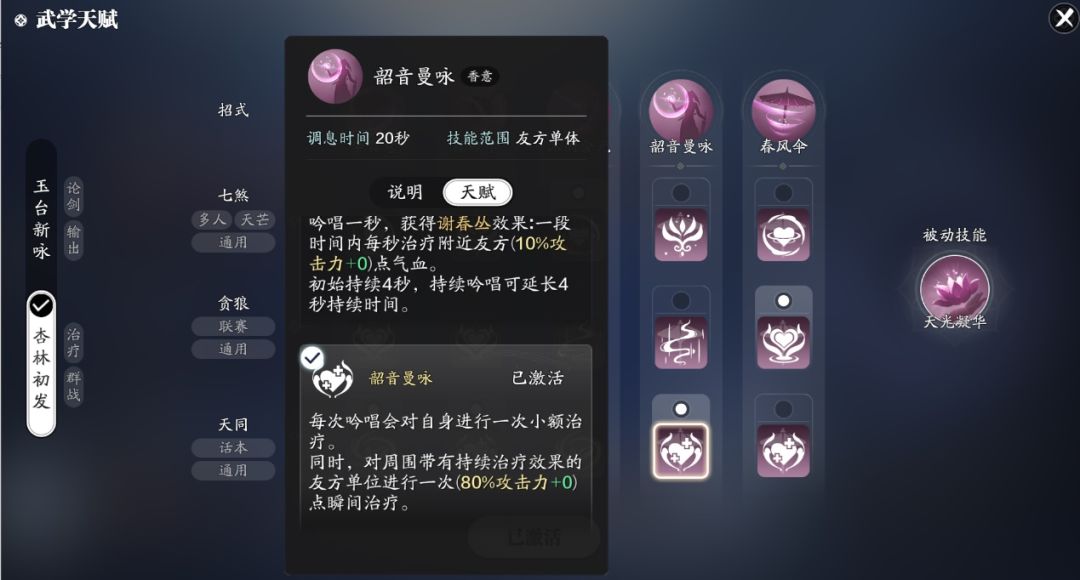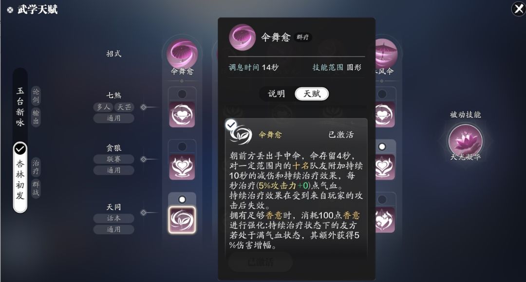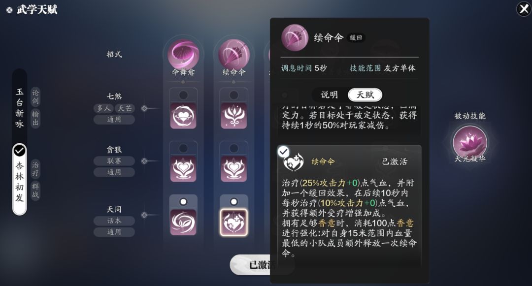 在天赋中我们选择天同天赋。韶音曼咏作为天香快速回复香意的重要手段之一,并且每次使用该技能都会在释放期间快速减少其余所有技能的冷却时间。在天同的天赋作用下,每次使用时,会对自身进行一次小治疗效果,同时对身边带有持续治疗效果的队友进行一次瞬间治疗。那么什么是持续治疗呢?就像沐雨含光、续命伞、伞舞愈范围内的队员、春风伞,这些都具备持续治疗效果。