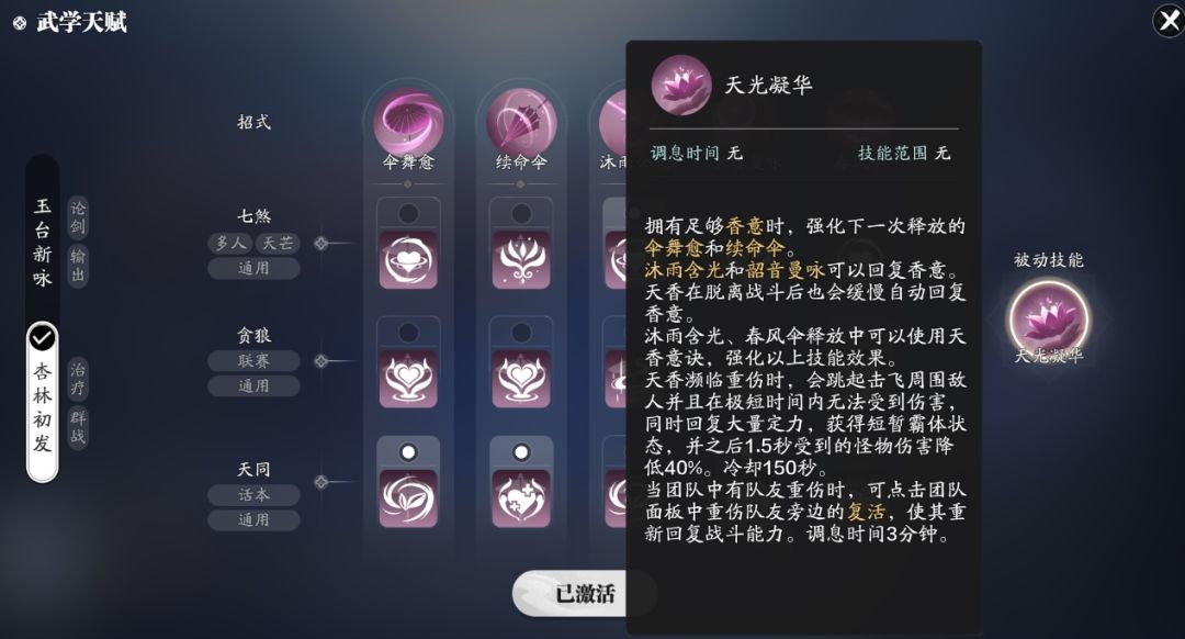 第一条就是在香意足够时,强化下一次释放的伞舞愈和续命伞,这点在前面技能介绍的时候已经提到了。第二条是在非战斗情况下可以自动回复香意。第三条也是天香在濒死重伤时会在极短的时间内无法受到伤害冷却为150秒。少侠可以理解为,当天香受到致死伤害时,不会立刻死去,而是有着一次活下来的机会。当然最后也少不了复活队友的效果,这也是天香重要的效果之一。