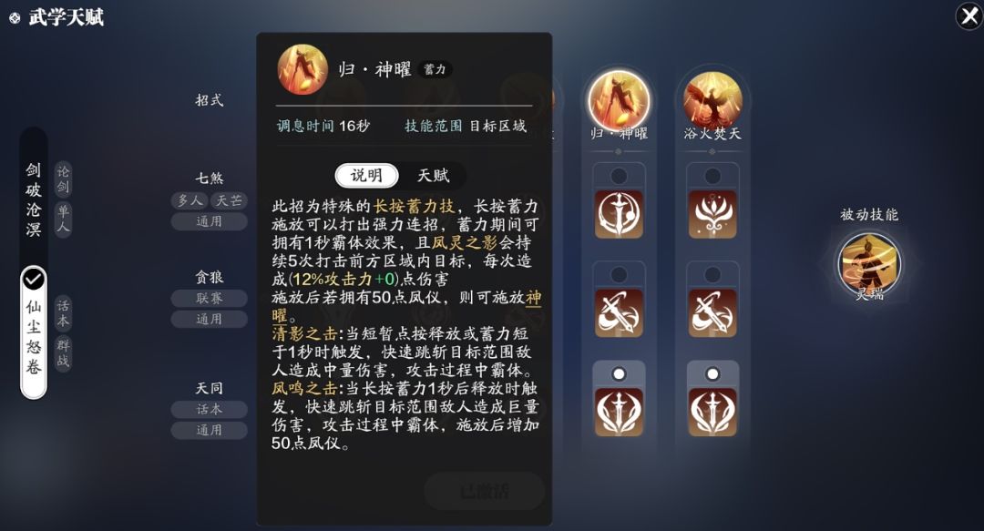 浴火焚天:先对自身周围敌人造成持续伤害后进入凤灵姿态,持续22秒,那么这里的凤灵姿态也就是之前提到的变身。当少侠使用浴火焚天后,技能图标将会被替换为无·烬劫。