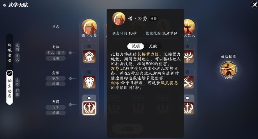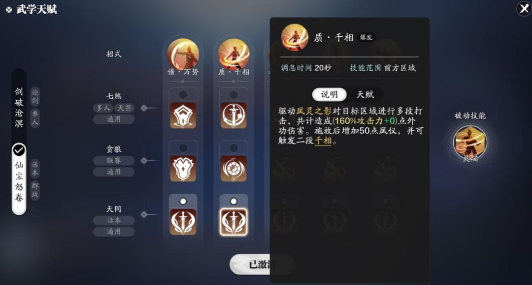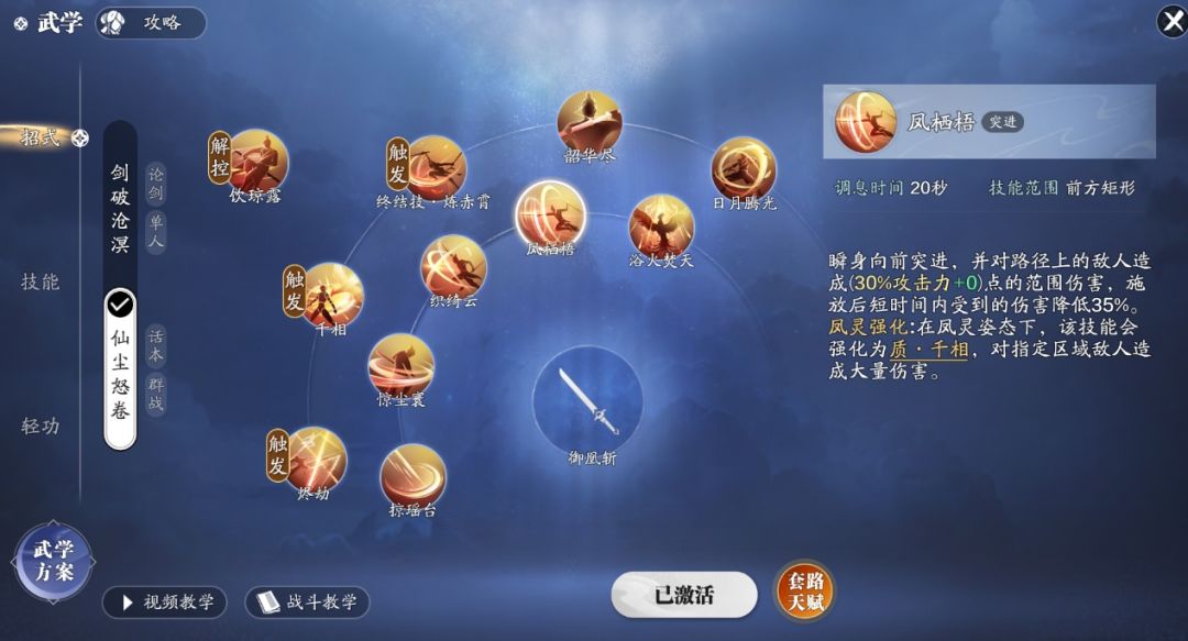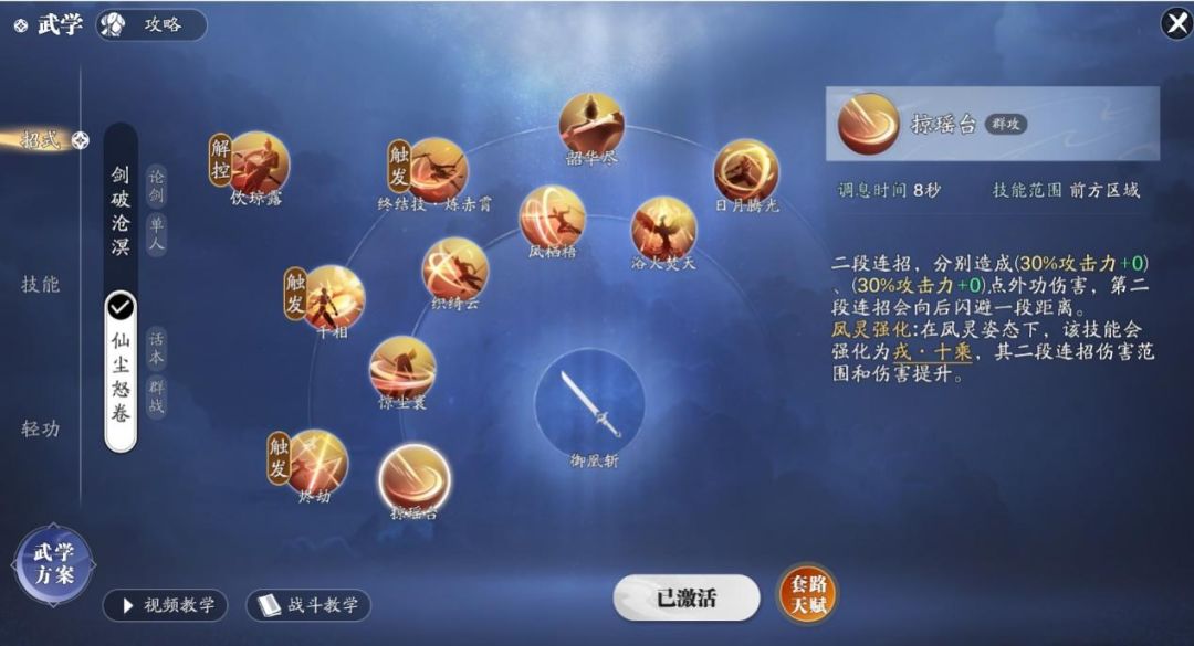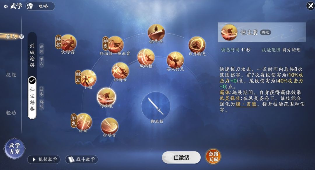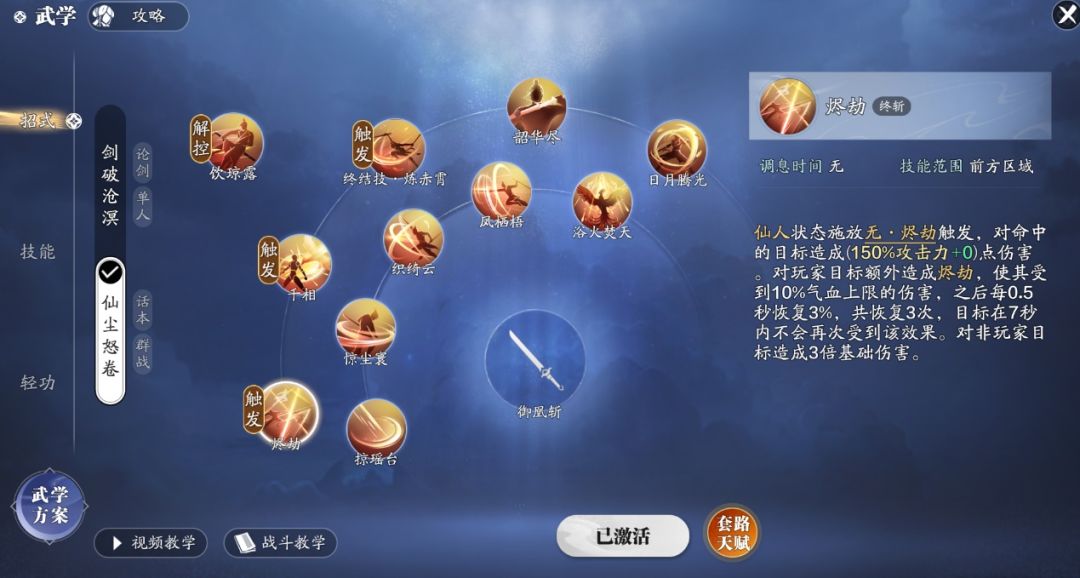 副本输出武学我们选择仙尘怒卷套路,首先我们先来了解一下技能吧。