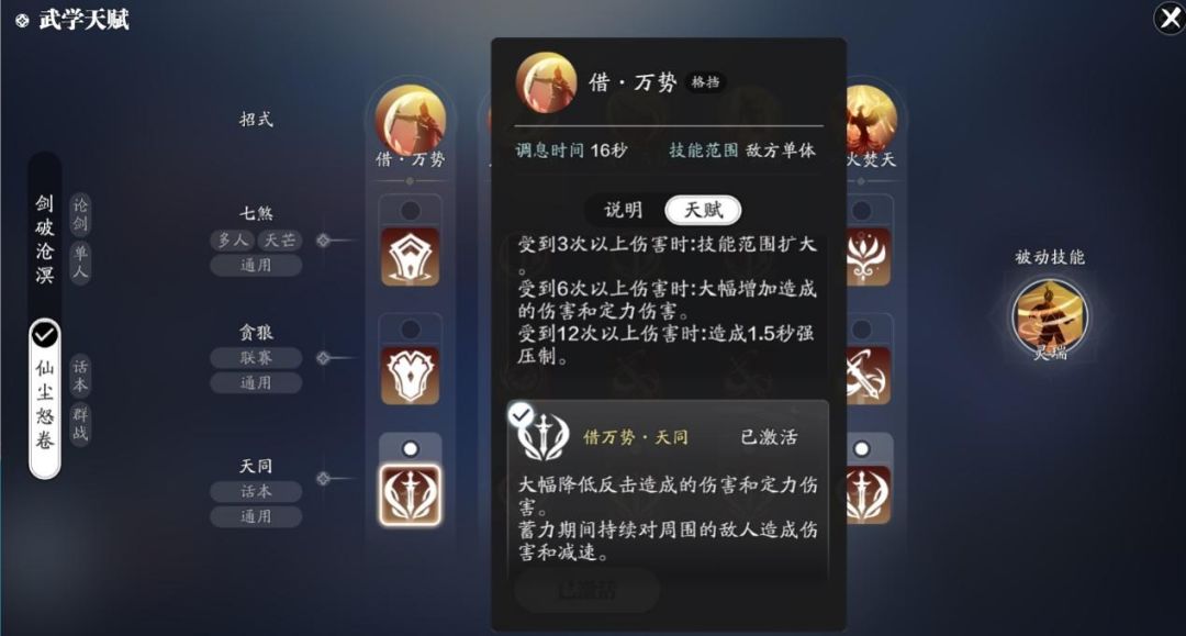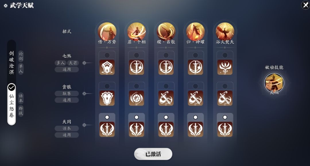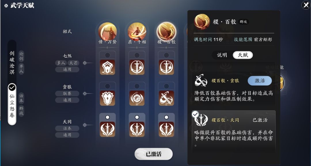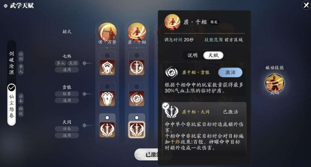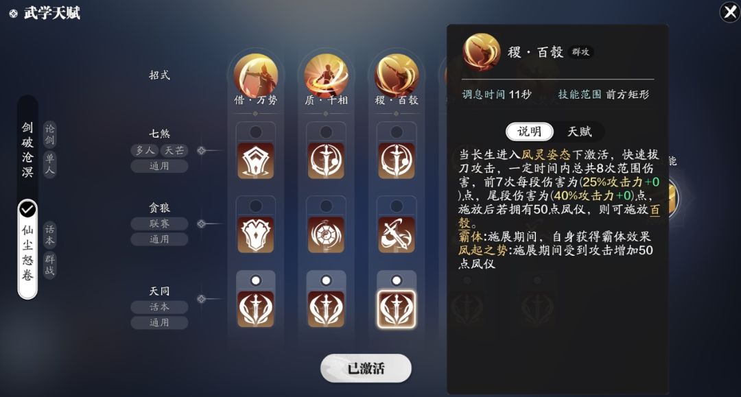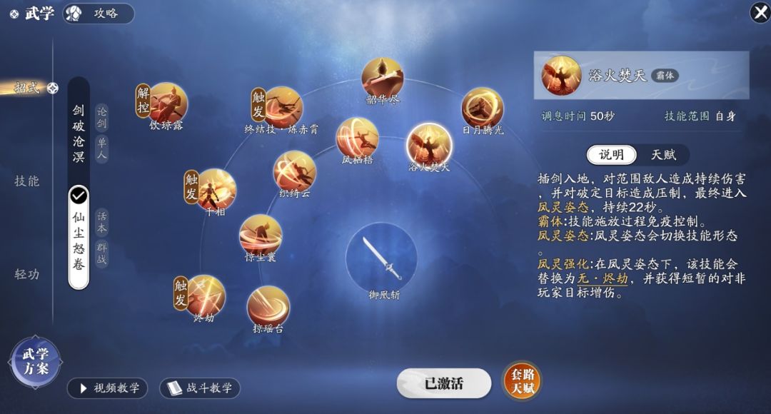 副本输出武学我们选择仙尘怒卷套路,首先我们先来了解一下技能吧。