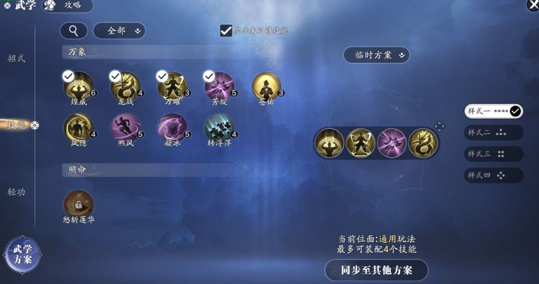 最后我们来说一下如何搭配万象技能,在选择上我们选取龙战,煌威,万曜,芳绽作为搭配技能。