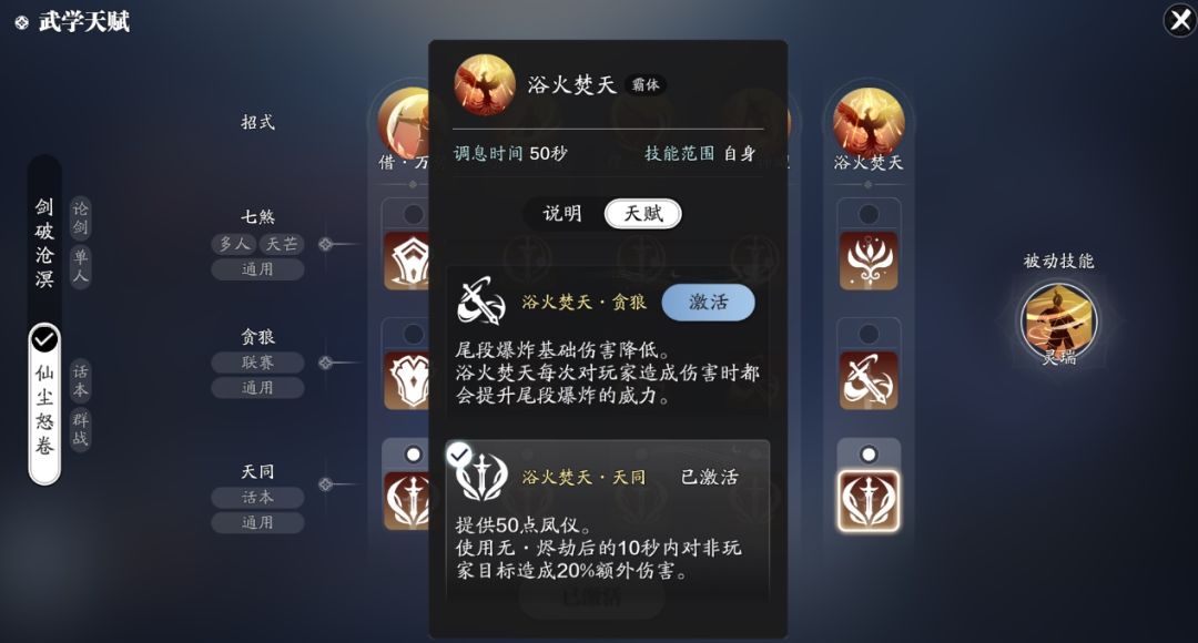 首先我们先说大招变身,浴火焚天。在天同天赋的加持下,我们可以很清晰的看到,使用无·烬劫后的10秒内对非玩家目标造成额外20%的伤害。并且提供50点凤仪,那么什么是凤仪呢?小编给各位少侠介绍一下。