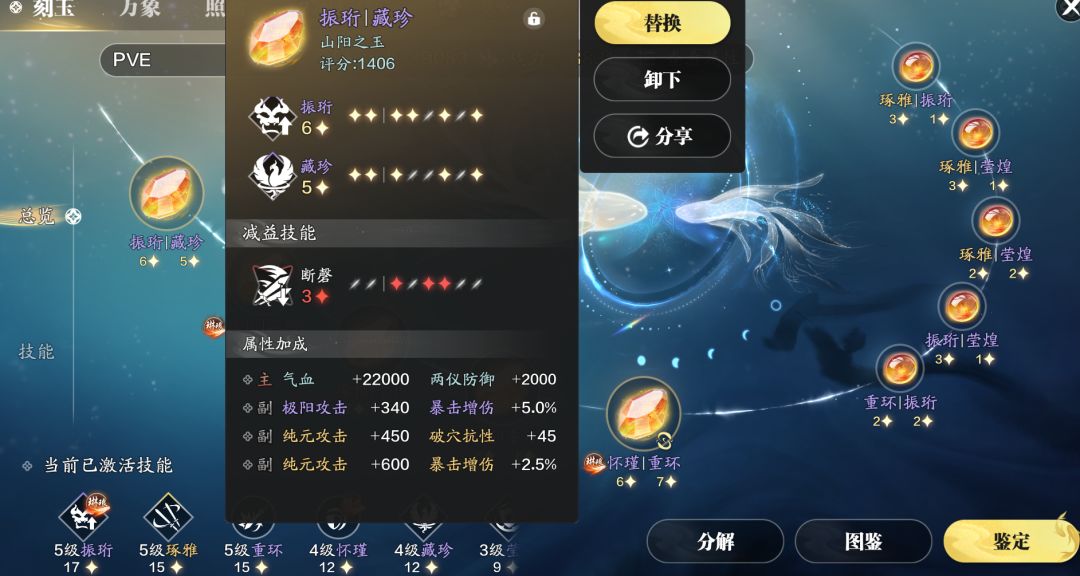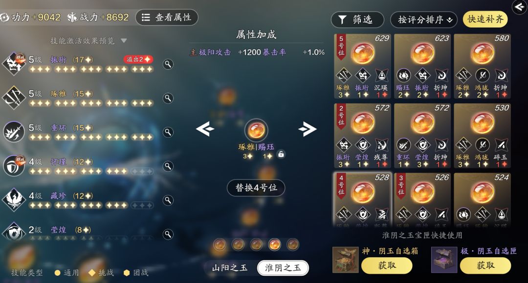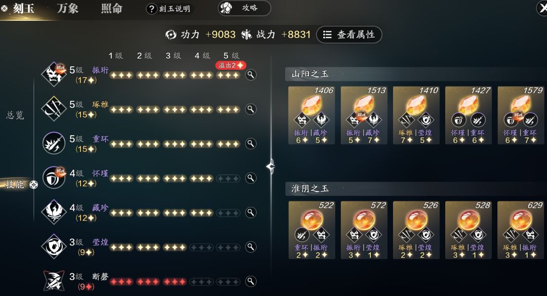 阳玉我们可以选择“振珩|藏珍”、“怀瑾|重环”、“琢雅|莹煌”这3个刻玉,以2+2+1的方式进行搭配,剩下的技能星数少侠用阴玉进行补齐,尽可能凑齐5条满级技能。