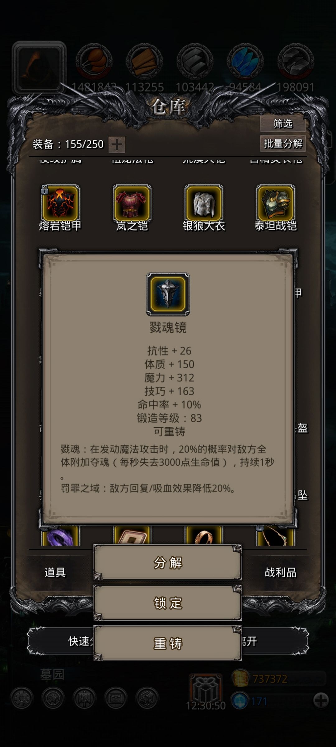 本来是没有自制红武和流血甲的(不推荐,资源少可以等圣庭和百臂),boss最后老是剩6,7万的血,火法疯狂未命中,玩的血压有点高,一气之下就把转职材料全分了做红装了,运气好出了个高魔红甲,顺便就把树拔了。