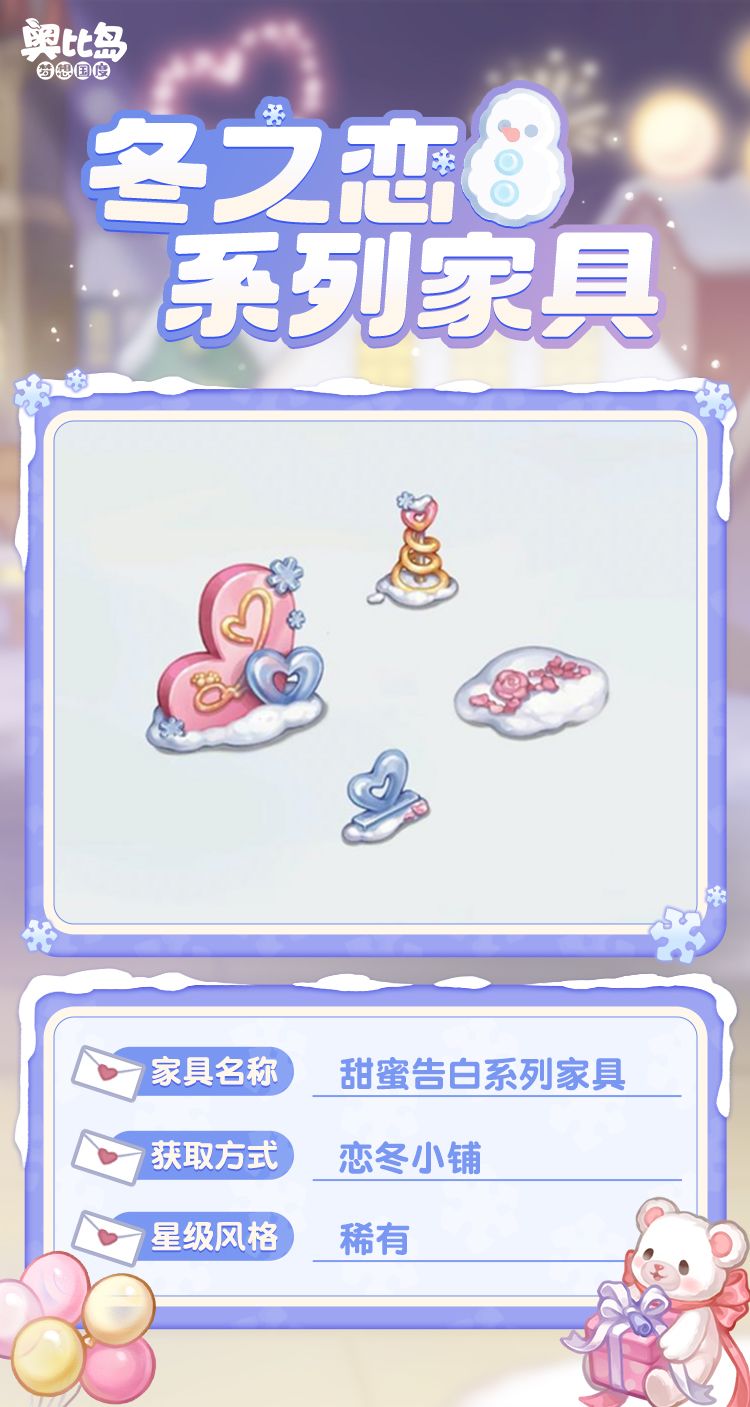 小奥比们参与「冬之恋」限时活动,可获得道具「恋冬手套」。「恋冬手套」可在「恋冬小铺」免费兑换「冬日恋心气泡」「冬日雪球衣」「暖冬毛绒护耳帽」「暖冬毛绒挎包」等装扮,以及「甜蜜约会飘雪窗」「甜蜜约会爱心椅」「甜蜜告白爱心板」「甜蜜告白旋转灯」等家具!诸多限定好礼,小奥比们不要错过啦~
