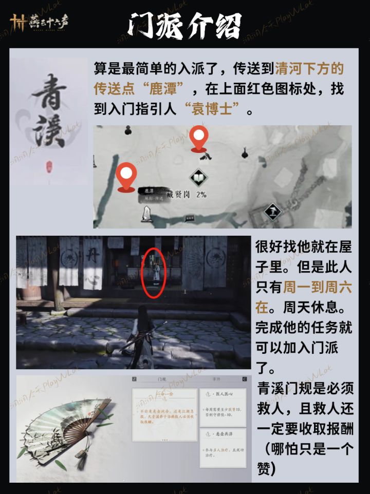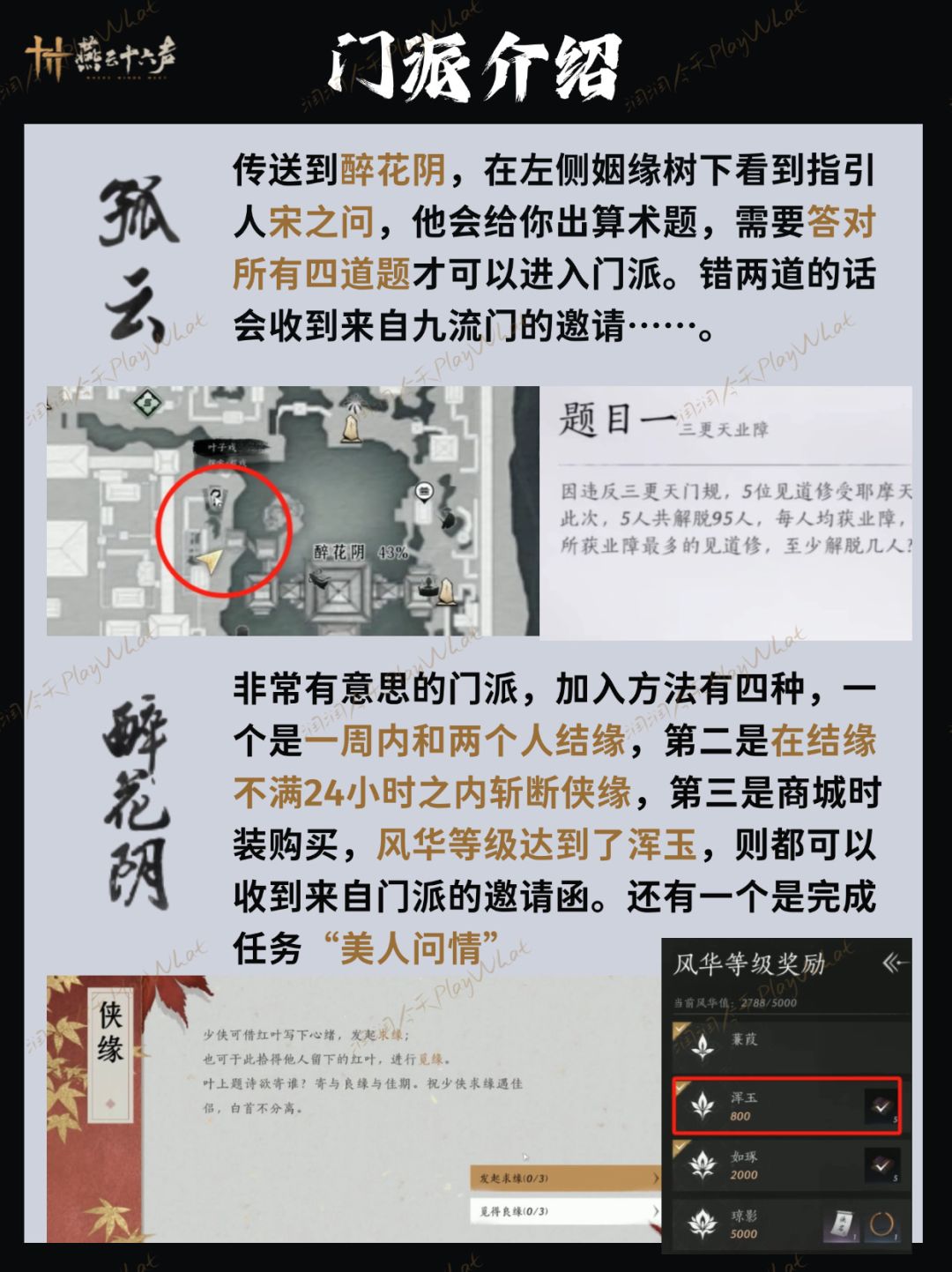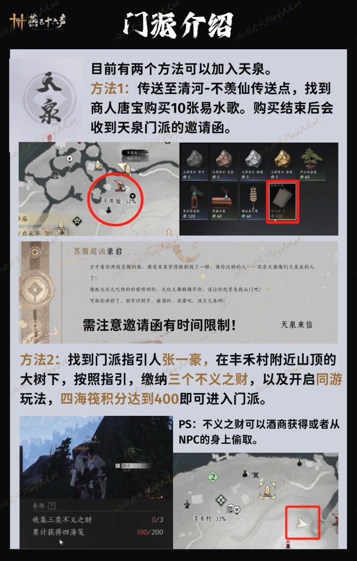 目前已开放7个可以加入的门派,分别为:天泉,清溪,三更天,孤云,醉花阴,梨园,九流门。每个门派都有自己独特的门规,武学,武器,大家可以结合自己的兴趣爱好择一加入。