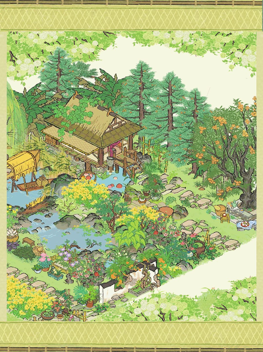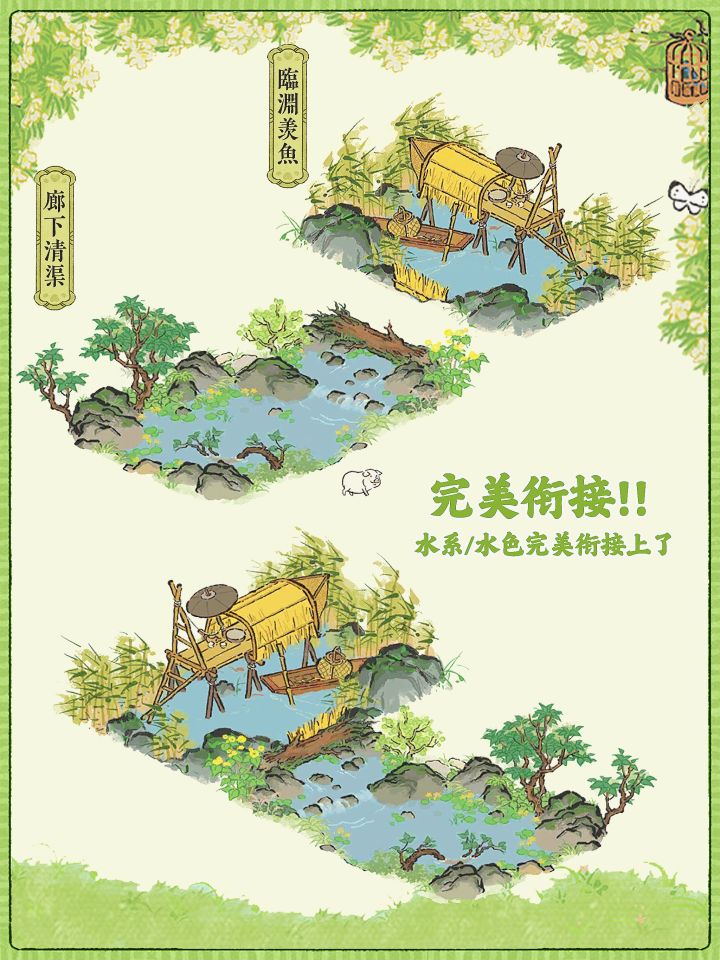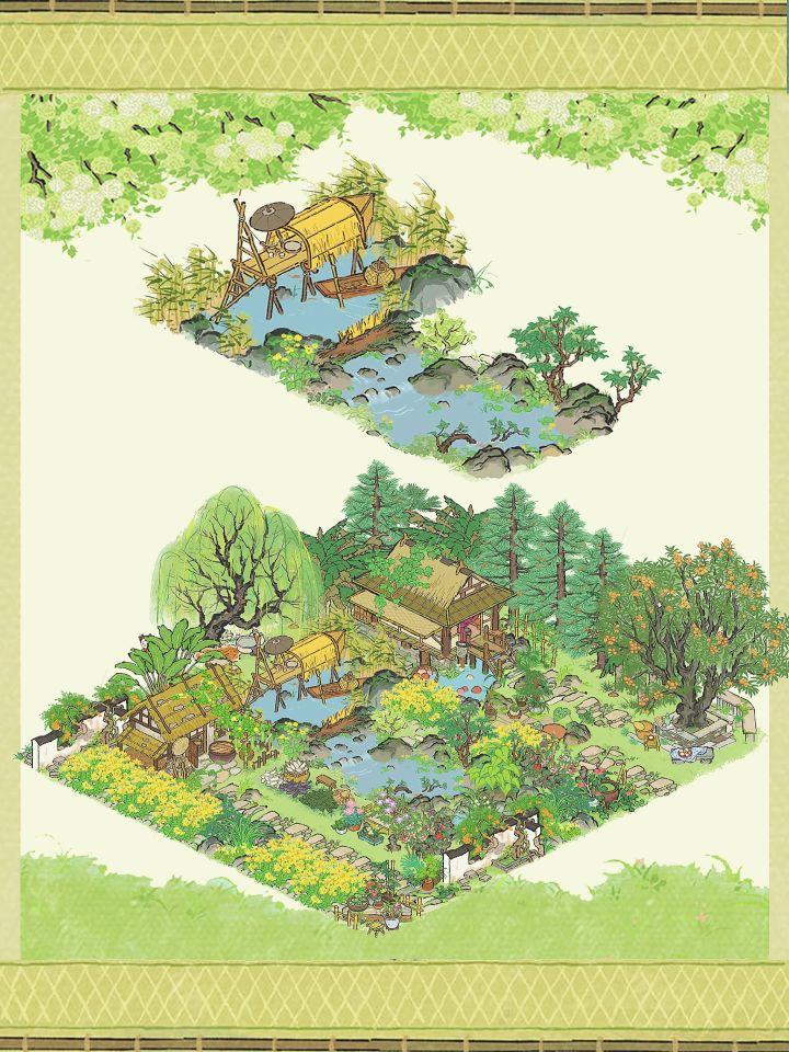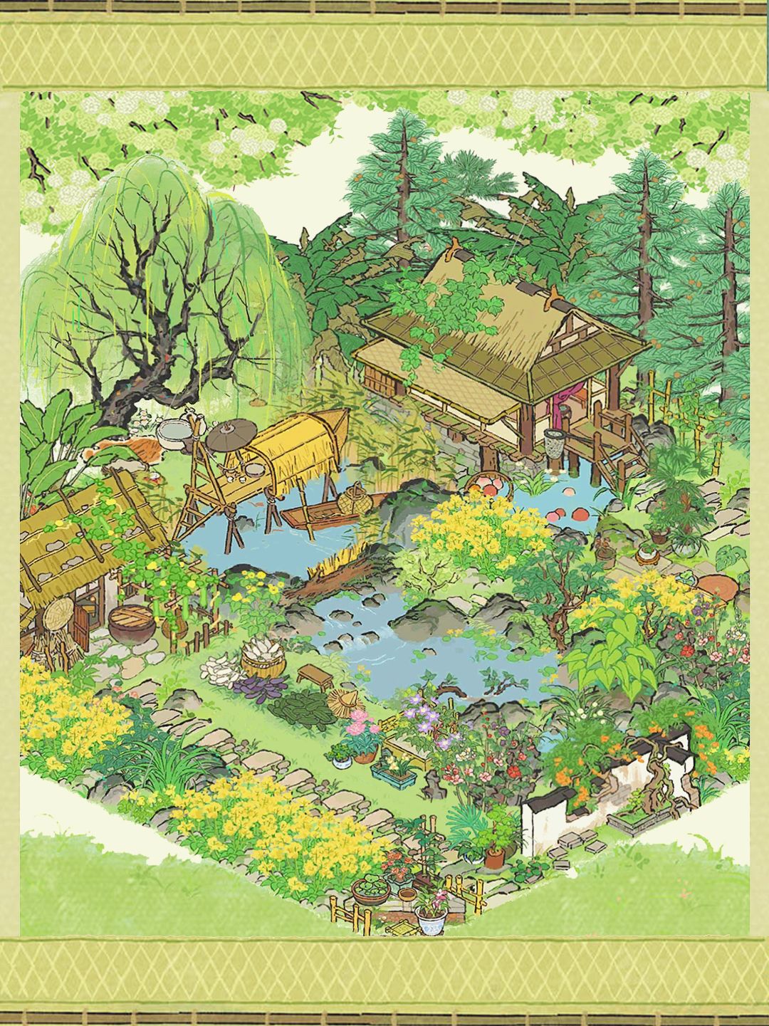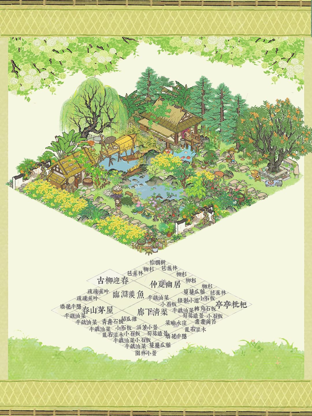 建筑:临渊羡鱼,廊下清渠,春山茅屋,仲夏幽居,亭亭枇杷,古柳迎春,墙花半隐,绿影小道