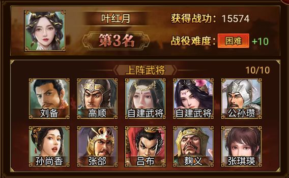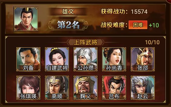 刘备、公孙瓒、张郃、孙尚香、张琪瑛、麴义、高顺、赵云、吕布、自建武将*1