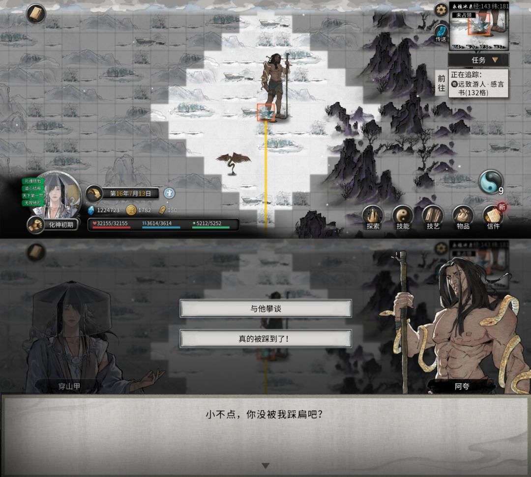 接下来我们把夸父的任务给做了,在我们收集化神→悟道的突破材料的时候,中间大概率会出现夸父被阻拦的剧情,我们直接前往任务地点查看即可。
