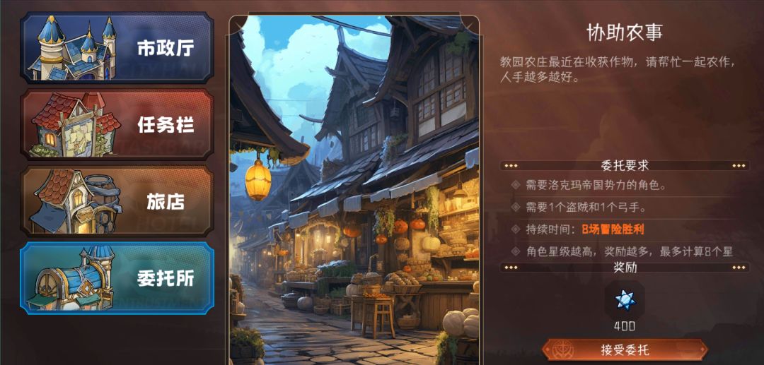 地图上的每个城市都有【委托所】,接取委托后可以把暂时不用的角色放进去挂机来获取材料,不同城市的委托产出不同。前期急缺的蓝星星等材料都可以通过挂委托来获取!