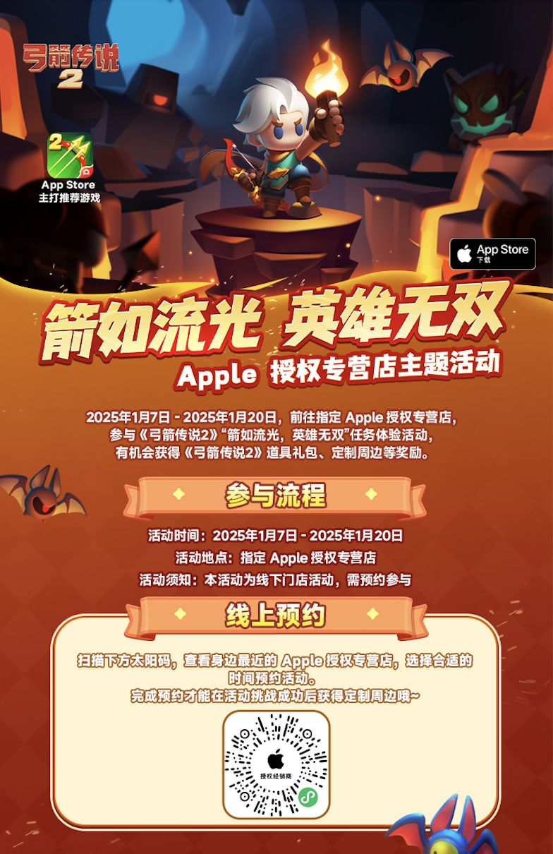 亲爱的弓箭手们,恰逢岁末,街道两旁已经有了年味儿,在这个特殊的时令,《弓箭传说2》携手 Apple 授权专营店开启线下特别活动,邀请所有弓箭手共赴一场冒险,快来一起参加这场线下狂欢吧~
