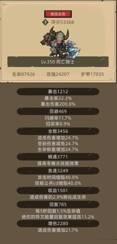评分5.33W,属性:暴击、回避、回复不要。满急速后主堆精通、全能