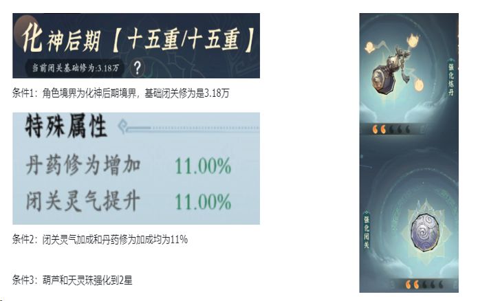 提升修为目前与几个特殊属性有关联,闭关灵气加成、丹药修为加成和洞府灵气提升,丹药修为加成是和葫芦有关系,闭关灵气加成是和闭关有加成。