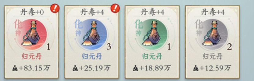 两仪葫芦:强化到2星后,1.5天可以获得1颗神品丹药,神品丹药会比白丹多很多的修为,我们以化神为例子,若将一颗白色品质的丹药升华后如图对比: