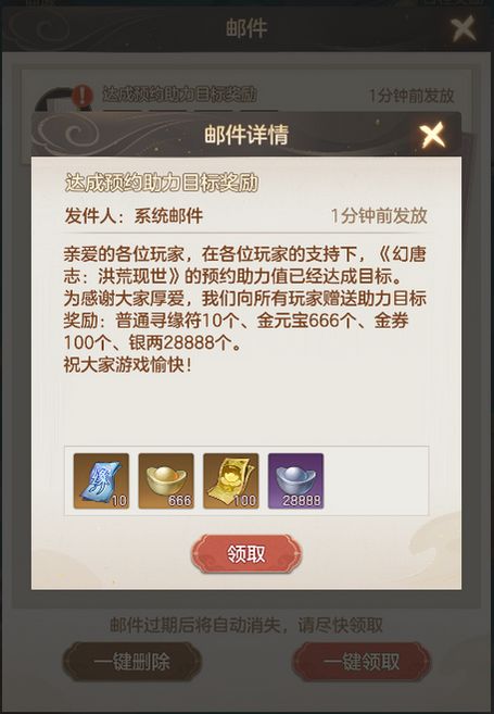 领取方式:登录游戏,角色等级升至28级解锁【邮件】后,前往【邮件】领取。