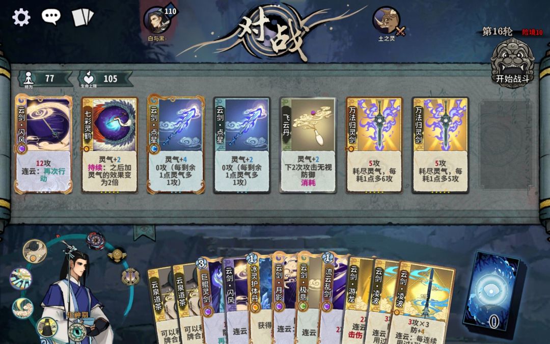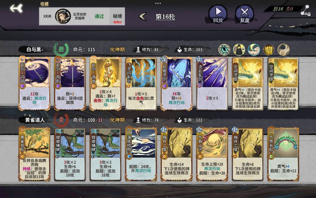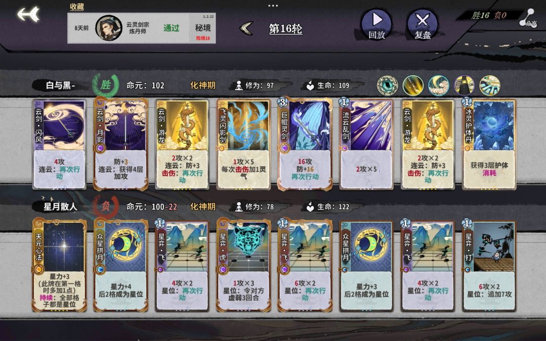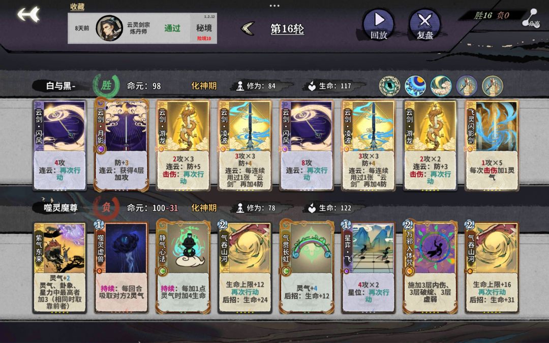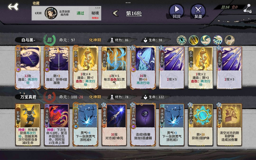 第3轮上筑基,摆牌三个云剑两个丹(消耗),从第三轮开始差不多就是每轮1d,存尽量多的d牌次数上元婴