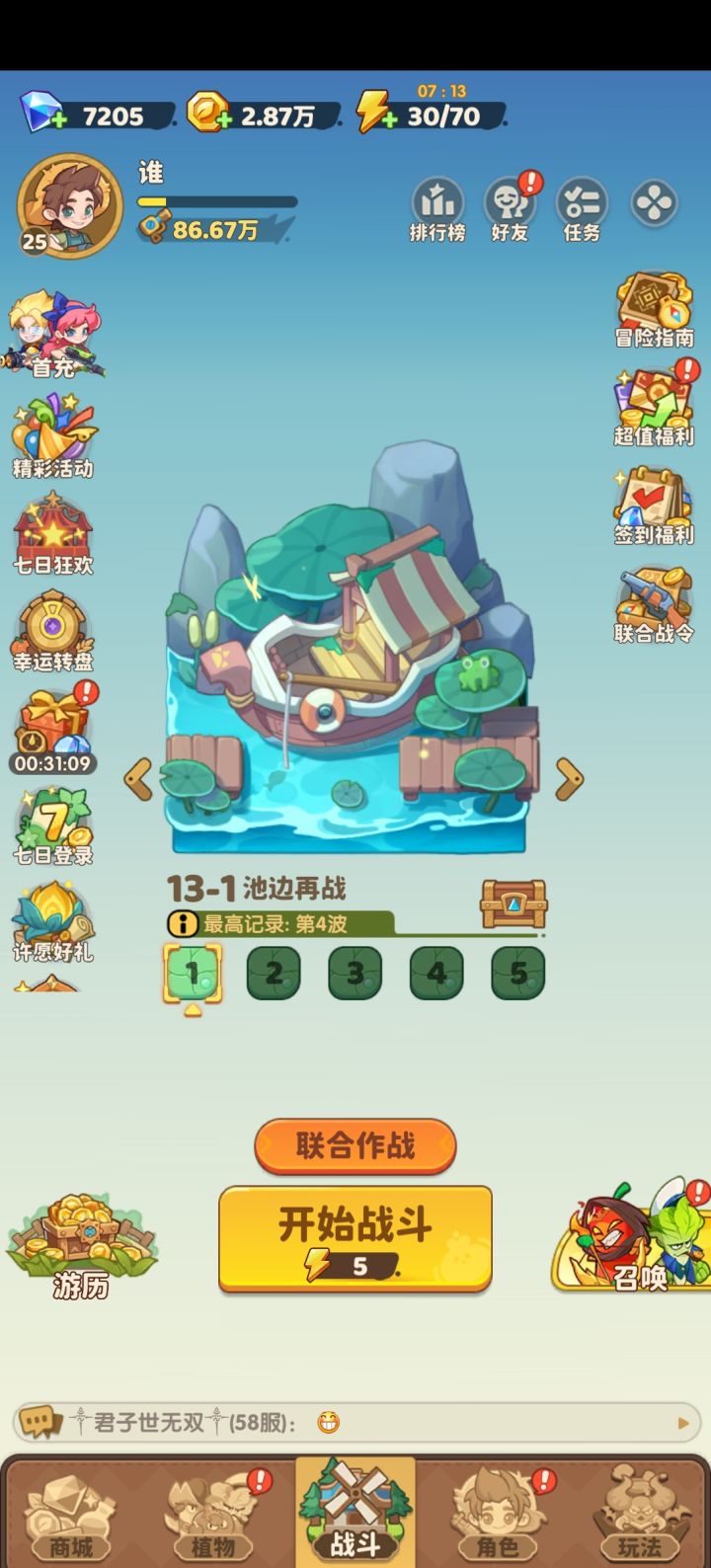 上边是流程重点决定你还能不能继续玩下去这游戏,下面就是一般攻略了:前期那个用树叶的普通祈愿遇到洋葱和大蒜就三倍,其余一倍放弃就完了,日常任务是每天五点刷新,切记你凌晨12点玩游戏看广告买体力和看广告领商店的东西别弄完了,第二天你活跃度就不够了!拿不到120活跃保底的80钻很难受的。前几天每天都会出一个冲榜尽力就行毕竟咱们不氪金主打一个陪伴,金卡保底建议选桃子或者香瓜,其实后边主关卡全靠甘蔗打输出香瓜和桃子都是辅助了,
