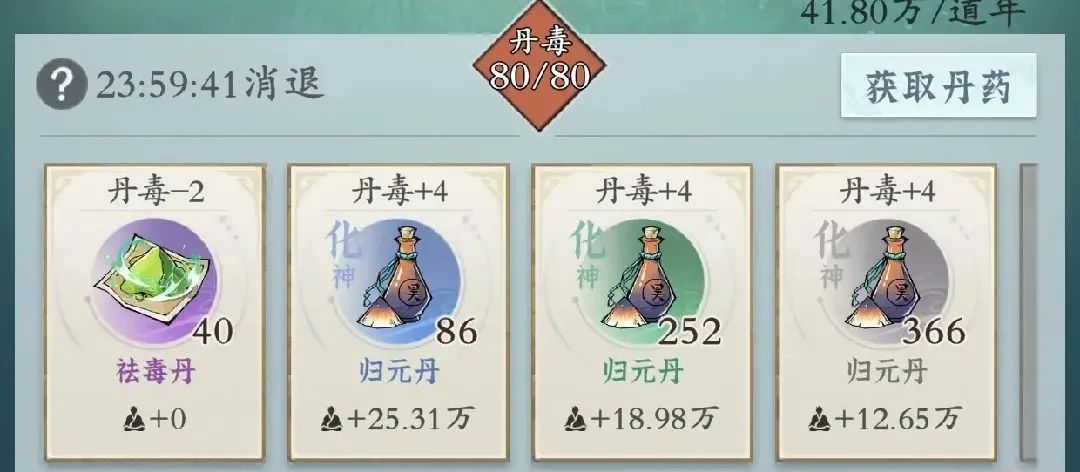 服用丹药会增长丹毒,丹毒满则无法继续服用。在前期,仙长们可以优先服用高阶丹药,把低阶丹药留给灵兽服用,提高修炼效率。完成神秘罗盘的房宿修复后,可以让提纯丹药的丹毒-2拍卖行开放后,仙长也可以拍到无丹毒的丹药(如神威露、金甲露等)。