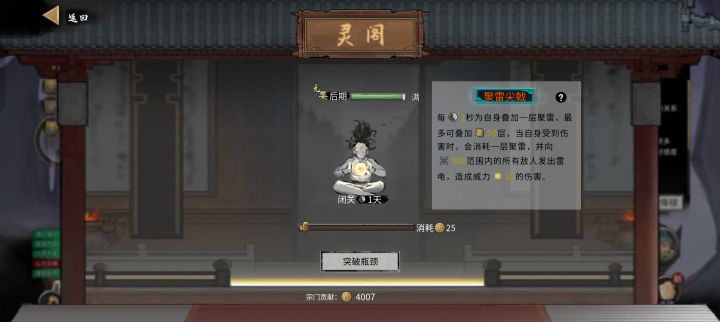 开局一定要刷到有雷功法宗门的地图(有次刷到个没有雷功法的门派地图在不知道有插件的情况下纯肝累麻了都没找到) 在灵阁突破可以获得特有“聚雷尖戟”