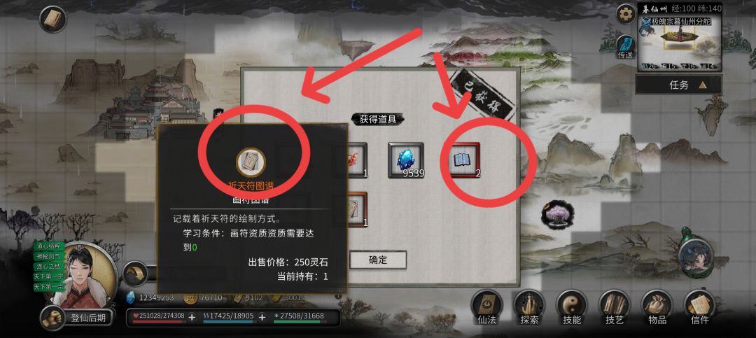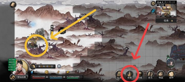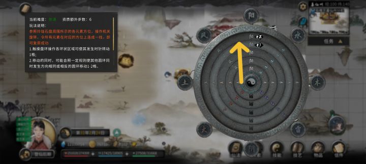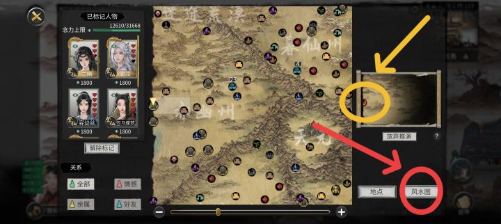 首先使用风水图,会给你一个画叉的位置,有些玩家初期使用后,没有找,导致以后用风水图一直提示“只能用一张”,在地图里选“风水图”,可以删除任务。然后在大地图找到大概位置,使用“堪舆”风水,位置正确会出现个宝箱(和金色宝箱不同),如图示,然后开始风水小游戏,从外往内或从内往外,有一圈是单独运转的,为最后,中间是剩余转动次数,上阳,对齐后成功,失败没有第二次机会,只能另找一张。可以开出很多秘宝,比如图纸。