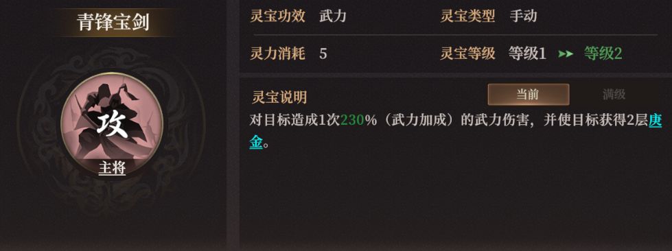 在1级效果时就有高达230%的武力加成伤害,算得上十分强力了,再加上能给敌方附带上庚金效果,可以说是同时兼顾了短期爆发与持续伤害。